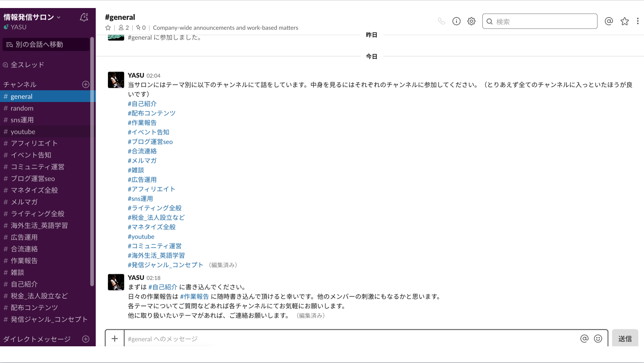 情報発信サロンのSlack画面↓(PCの場合)